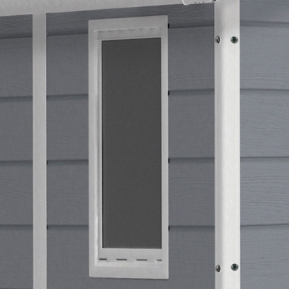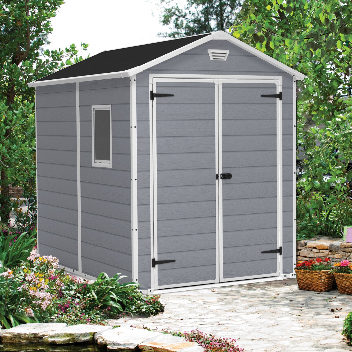 This product makes your garden and garage clutter-free and provides the perfect storage space for all your needs. This Manor 6 ft. W x 7.4 ft. Plastic Storage Shed is the perfect addition to your outdoor space and keeps your tools well-organized. The Manor 6 ft. W x 7.4 ft. Plastic Storage Shed is made from a premium quality material that offers long-lasting performance. The sturdy gable design provides excellent durability and lends a traditional touch to the outdoor decor. The gray and white enhances its overall appeal and complements most homes. It has one fixed window and an opening at the top for ventilation and better airflow to move the chemical smells. The Manor 6 ft. W x 7.4 ft. Plastic Storage Shed is ideal for storing most tools and offers maximum storage in minimal space. This tool shed has two front panel doors, which opens wide for better accessibility. The sturdy roof and floor offer versatile placement options. It is ideal for gardens, lawns, and backyards.