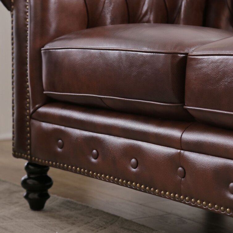 Not just a piece of furniture, the Evansburg 87" Genuine Leather Rolled Arm Chesterfield Sofa is an artful accent whose characteristic silhouette and distinctive details have withstood the test of time. Bring all that charm to your living room arrangement with this design! Sporting rolled arms, on-trend button-tufting, and classically turned feet, it invites you to lounge with a book or curl up with a cup of tea as it infuses your space with an eye-catching style. Its solid wood frame features pocket spring seats filled with foam and dacron for comfort.