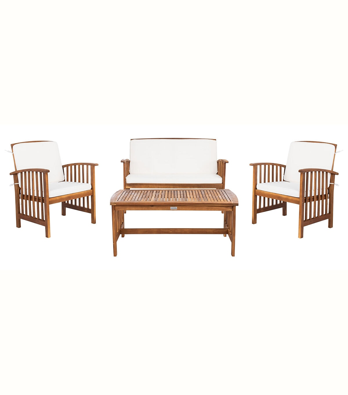 The open and airy design of the Rocklin 4 piece outdoor set combines form and function. The slatted silhouette aids rain drainage while creating chic contemporary forms. The set is crafted of acacia in a brown finish with beige all weather cushions.