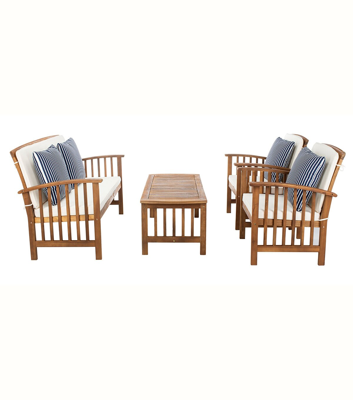 The open and airy design of the Rocklin 4 Piece Outdoor Set beautifully combines form and function. Its slatted silhouette is great for rain drainage while creating chic contemporary shadowplay. Crafted of naturally finished acacia with all weather beige cushions and square pillow with thin navy stripes.