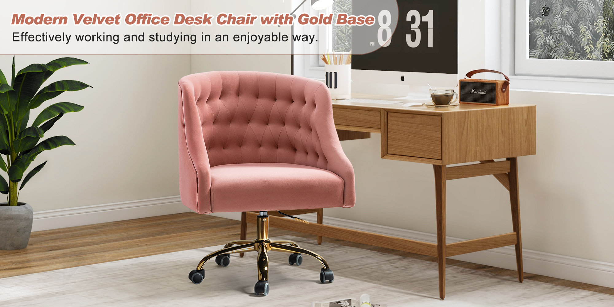 This isn't your standard office chair! It showcases a modified wingback design with a rounded back and sloped, recessed arms for a distinctive look. Button-tufted details dot the back for a bit of texture. This ergonomic office chair is upholstered with velvet in a solid hue for a glam touch to any style — from modern to French country. Down below, it features gold-finished metal legs and five casters that allow smooth movement across your carpet or hardwood floor. It's also seat height adjustable with a swivel function that helps you move from task to task with ease.